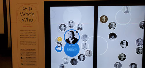 展示物の中には都倉副館長お薦めの「社中Who’sWho(しゃちゅう フーズフー)というデジタルコンテンツもありました。これは、諭吉の親類や友人および現代までの塾員を中心とした慶應義塾関係者(物故者)を紹介するデータベースです。タッチパネル型スクリーンの上に漂う肖像アイコンに触れると詳細画面が開き、その人物を紹介する仕組みになっています。何度もタッチして慶応義塾の人脈の広がりを体感できました。