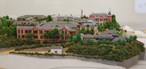 今から100年ほど前の大正12(1923)年頃の三田キャンパスを再現した模型も見応えがありました。三田山上と、現在生協などがある西側低地にあった幼稚舎、現・中等部の位置にあった普通部を含めた範囲が285分の1のスケールでリアルに再現されています。ほとんどの建物が木造だったことから、大正12年以降、関東大震災や空襲などで変貌を重ね、模型での再現には多くの困難が伴ったそうです。当時と同じ位置で現存する建物は、旧図書館だけということで、改めて旧図書館が慶応のシンボルということを実感しました。