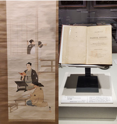 常設展示室を出てすぐ隣にある企画展示室では、開館を記念して「慶応四年五月十五日―福澤諭吉、ウエーランド経済書講述の日」が開催中でした。戊辰戦争のさなかの慶応4(1868)年5月15日、上野で官軍と彰義隊の戦闘があり、砲声が江戸市中に響きわたる中、福澤諭吉は動ずることなくいつものようにウェーランド著の経済書を講述し、学問研究の一日もゆるがせにできないことを塾生に示しました。この故事に因み、当時芝新銭座にあった慶應義塾で諭吉が講義を続けている姿を描いた安田靫彦画伯の日本画と、諭吉がアメリカから持ち帰ったウエーランド経済書が出品されていました。