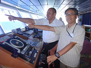 ピースボートの旅行企画・実施会社ジャパングレイスの代表・狭間俊一さんの案内で約30分間操舵室を中心に見学しました。操舵室は航海士2人1組・4時間交代で勤務しており、ガランとしていました。普段船長はいないとのこと。早速、舵を操るポーズをとって記念撮影をしました。航海士も笑顔で一緒にカメラに収まりました。サービス満点です。