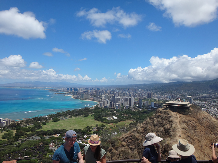 2017年7月12日、中米グアテマラから11日間かけて最後の寄港地、ハワイのホノルルに着きました。約40年ぶりのハワイ、旅の疲れを癒すのに最適の地で2日間を過ごしました。初日はハワイのシンボル、ダイヤモンド・ヘッドに登りました。1700年代後期、西欧の探検家や商人たちが噴火口壁面に光る方解石の結晶をダイヤモンドと見誤ったことからそう呼ばれるようになりました。
