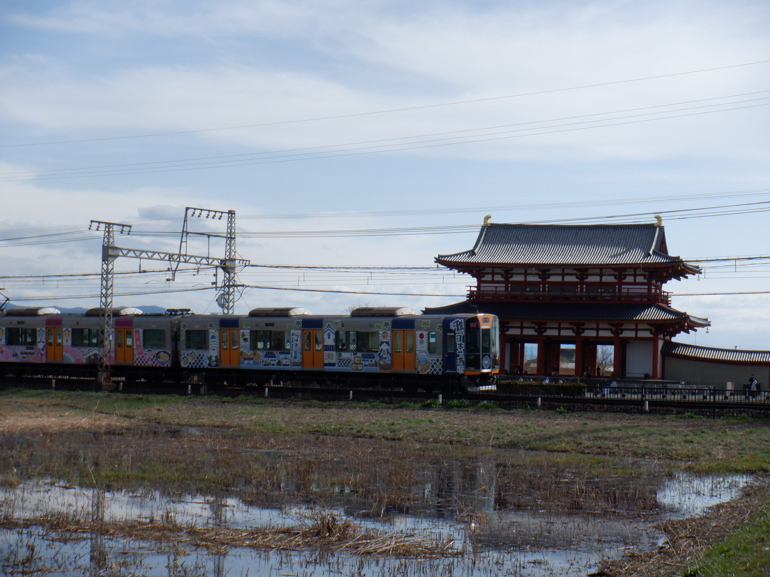 =写真は平城宮跡の朱雀門の近くを通過する近鉄電車(奈良市)