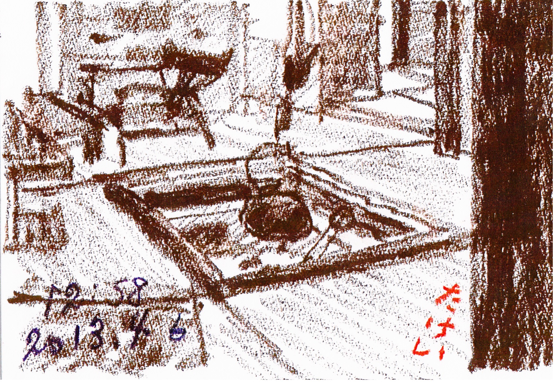 一般公開の日にこの川喜多邸、和辻哲郎の旧居を訪れる。家屋、定位された空間の入ったところが土間であり、そこに囲炉裏があった。この土間から部屋へ、という場所に立派な大黒柱が姿を見せていたが、大黒柱の近くに部屋の(居間だろう)囲炉裏があり、この部屋には洋風の大きなテーブルと椅子が置かれていた。大黒柱と囲炉裏などをスケッチする。