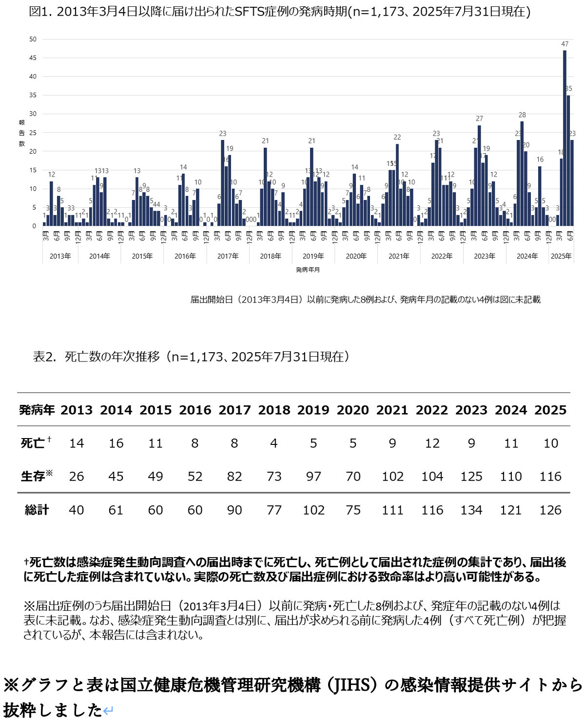SFTSは、Severe Fever with Thrombocytopenia Syndrome(重症熱性血小板減少症候群)の略だ。2013年1月、山口県で日本初の感染者(50歳代女性、前年の秋に発症して死亡)が確認された。病原体は新種のウイルスで、このSFTSウイルスが感染者の血液などの体液に含まれ、それに接触して感染し、発症すると、高熱が出て下痢、下血、嘔吐、けいれん、意識障害を引き起こすとともに血小板や白血球が減少する。感染者の9割が60歳以上だ。多臓器不全で死亡するケースがあり、2013年3月から2025年7月までに届け出のあった死者数は122人で、致死率は27%とかなり高い。
