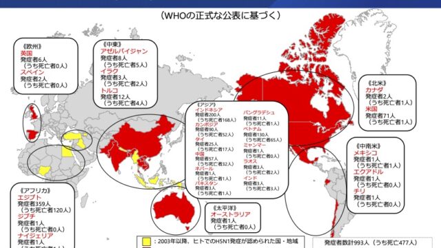 国ごとにサーベィランス(調査・監視)の能力に差があるので必ずしもこれらのデーターが正確だとは言い切れないが、ニワトリを殺処分する体制が世界各国で徐々に整ってきた結果、感染者と死者が減ってきているのだと考えられる。その一方でアメリカやインド、スペイン、イギリスなどの国に新たに拡大している実態もある。