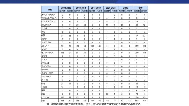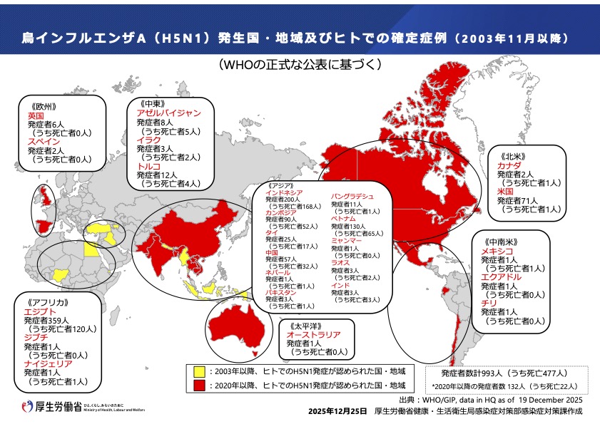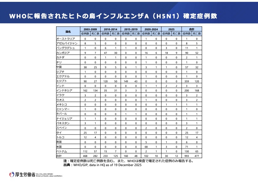 WHOの公表をもとに厚労省がまとめた「H5N1発生国・地域及びヒトでの確定症例」の世界地図(2025年12月25日作成)と「確定症例数」の表(同)=図表参照=を見ると、2003年から2025年の22年間に993人に感染し、うち477人が死亡していることが分かる。